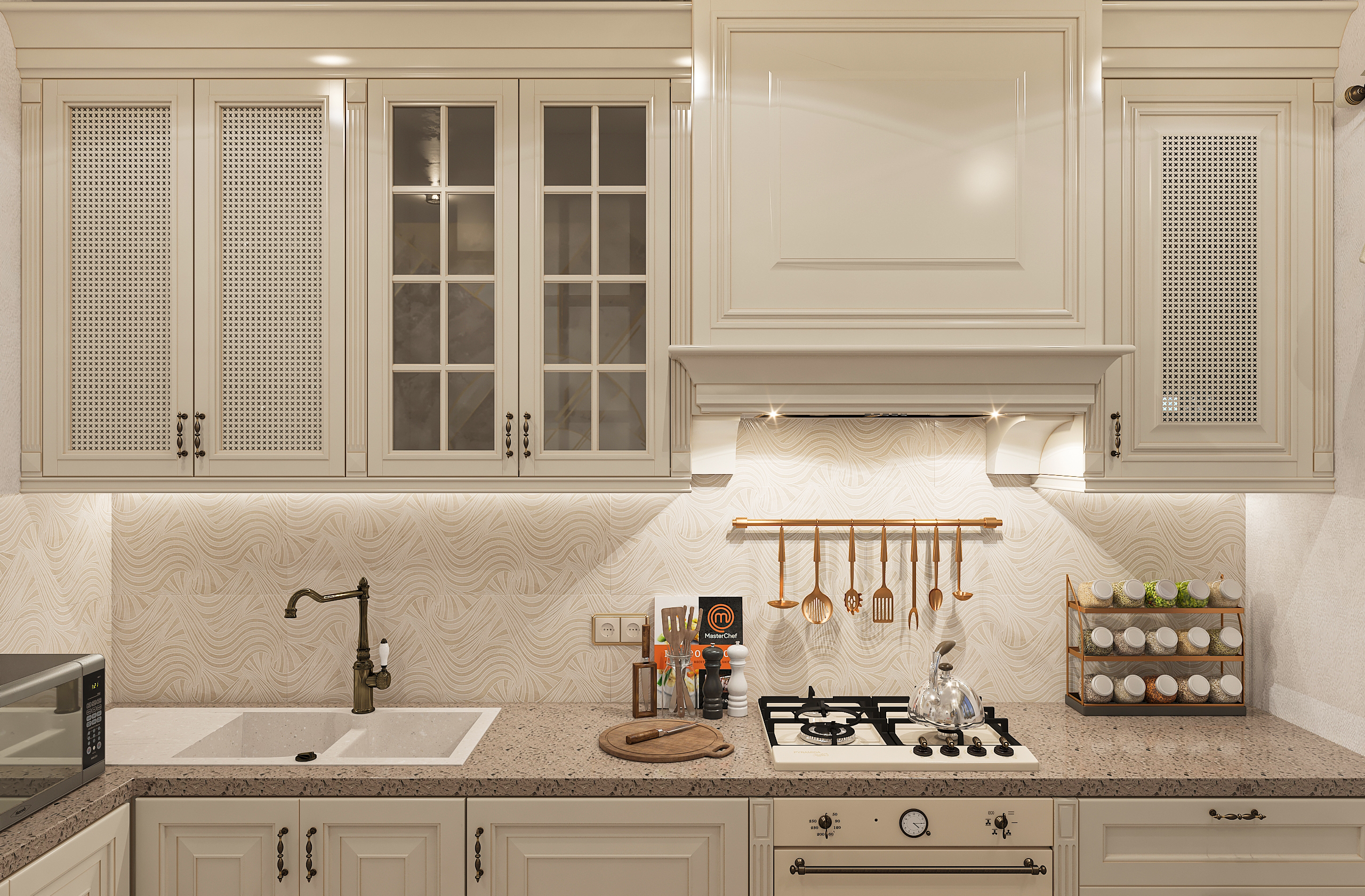 Кухня и столовая оформлены в изысканном классическом стиле с современными материалами и встроенной техникой.