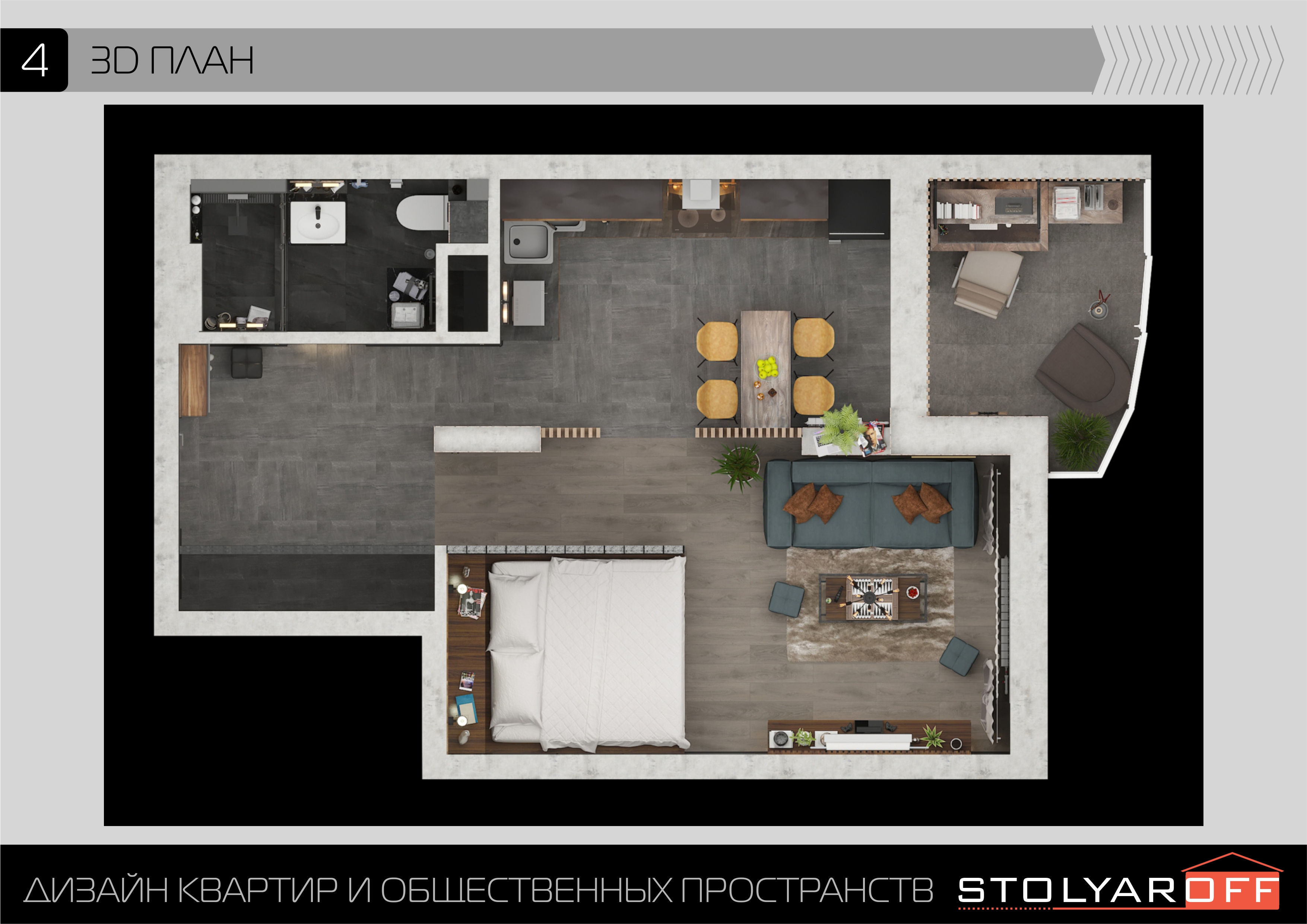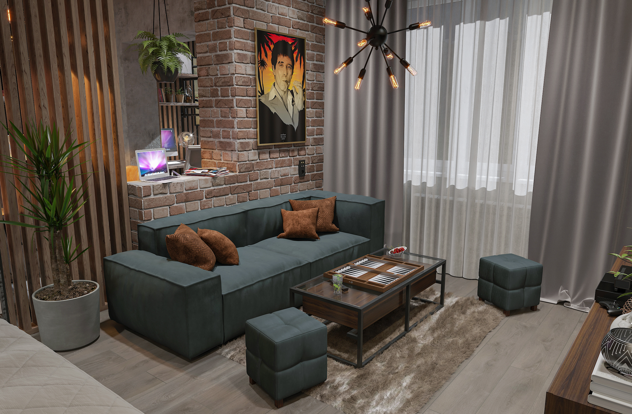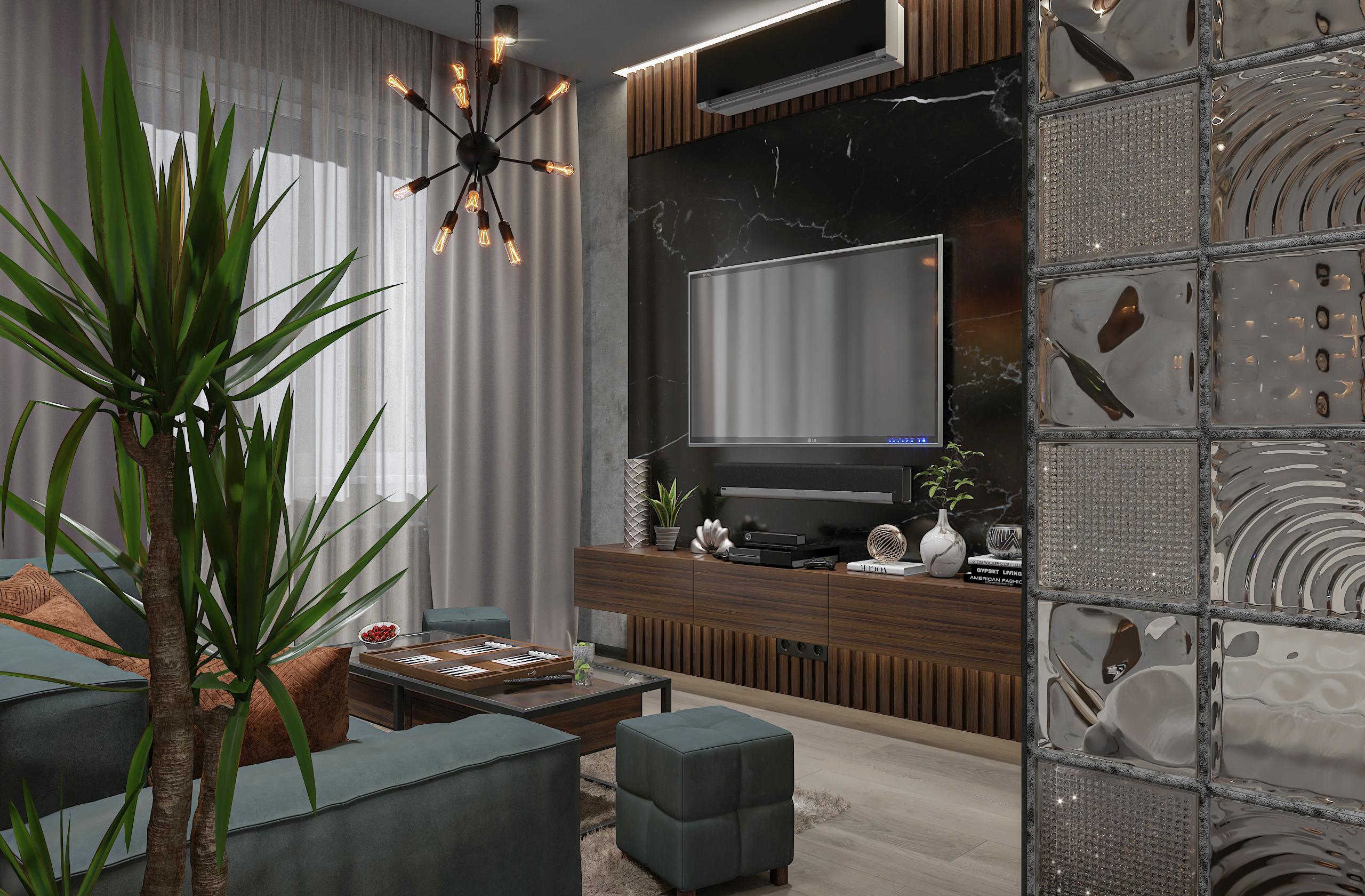 Открытое пространство зонировано легкими перегородками на кухню, гостиную и спальню; много естественного света поступает через панорамные окна. Лаконичная мебель, барная стойка и современная техника обеспечивают максимальный комфорт, а акцентное освещение и декор с живыми растениями подчеркивают индивидуальность интерьера. Минимум перегородок, максимум функциональности — всё для независимого и динамичного образа жизни.