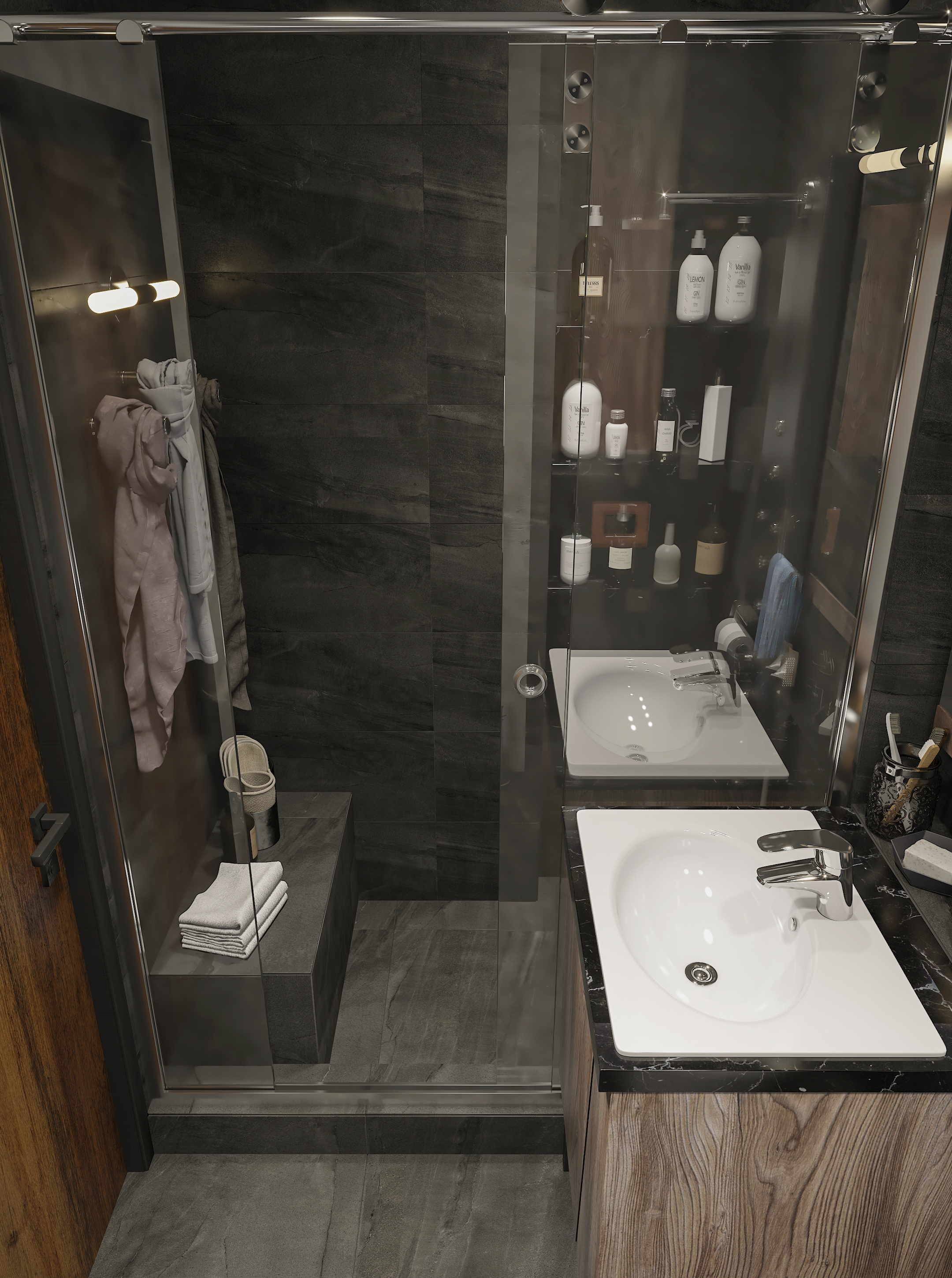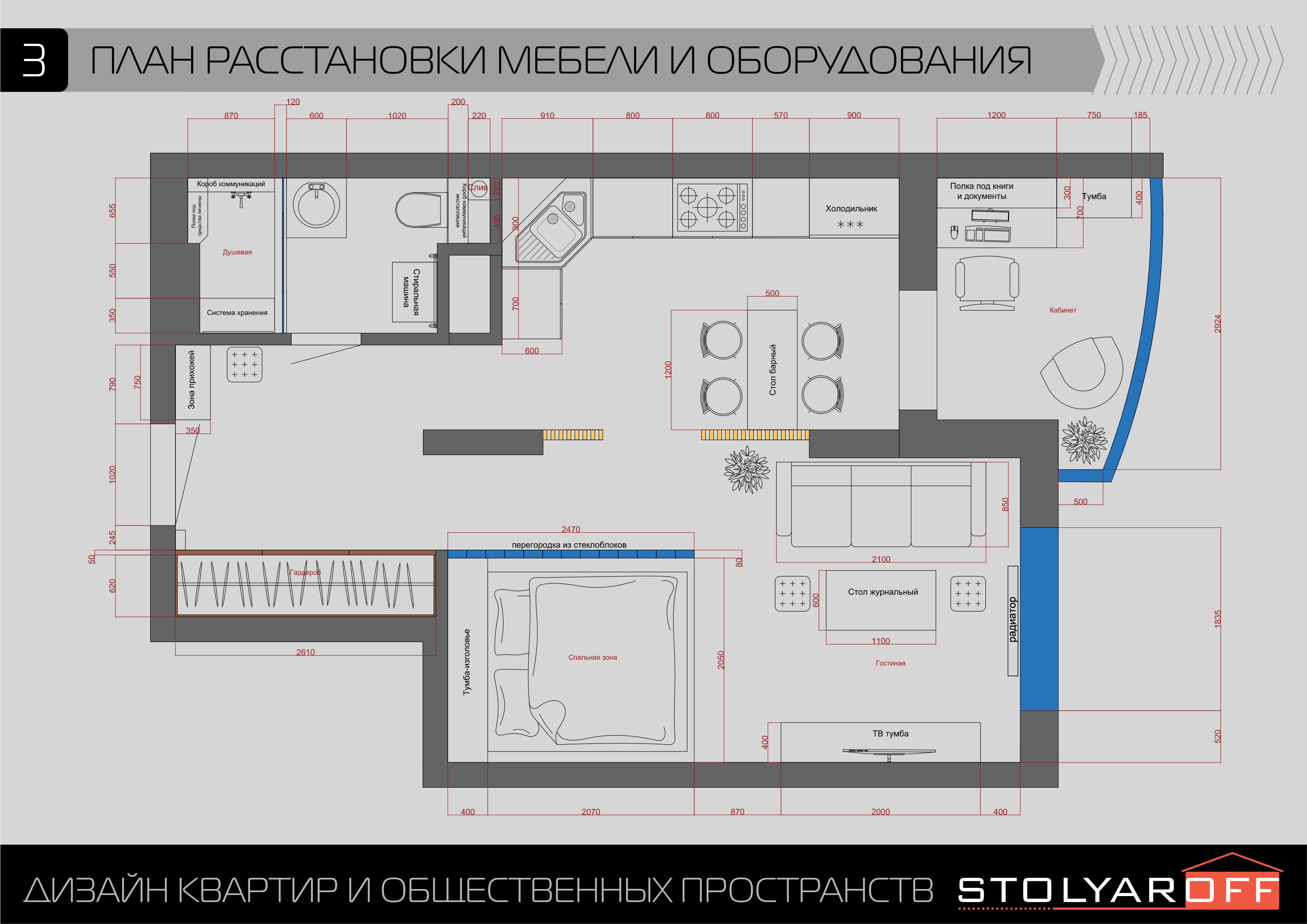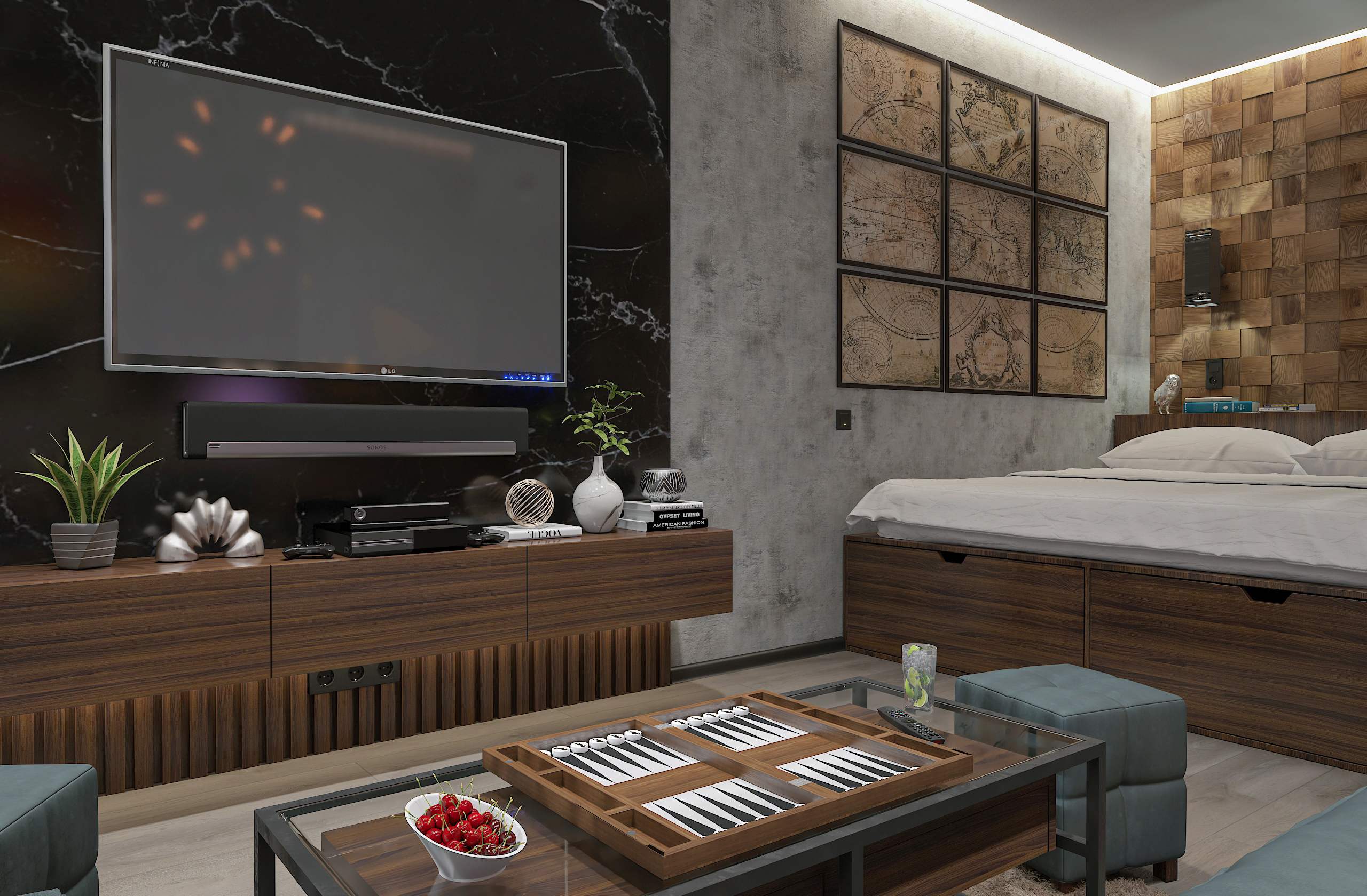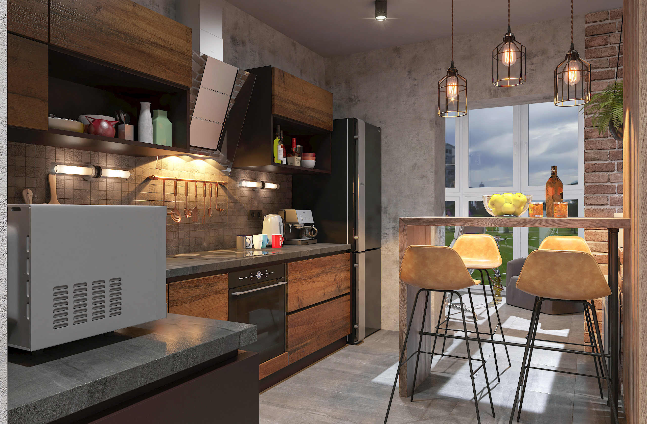 Открытое пространство зонировано легкими перегородками на кухню, гостиную и спальню; много естественного света поступает через панорамные окна. Лаконичная мебель, барная стойка и современная техника обеспечивают максимальный комфорт, а акцентное освещение и декор с живыми растениями подчеркивают индивидуальность интерьера. Минимум перегородок, максимум функциональности — всё для независимого и динамичного образа жизни.
