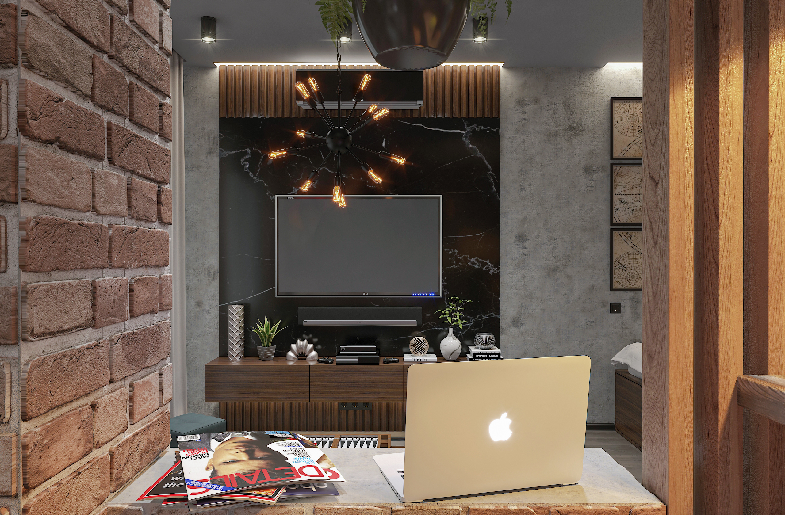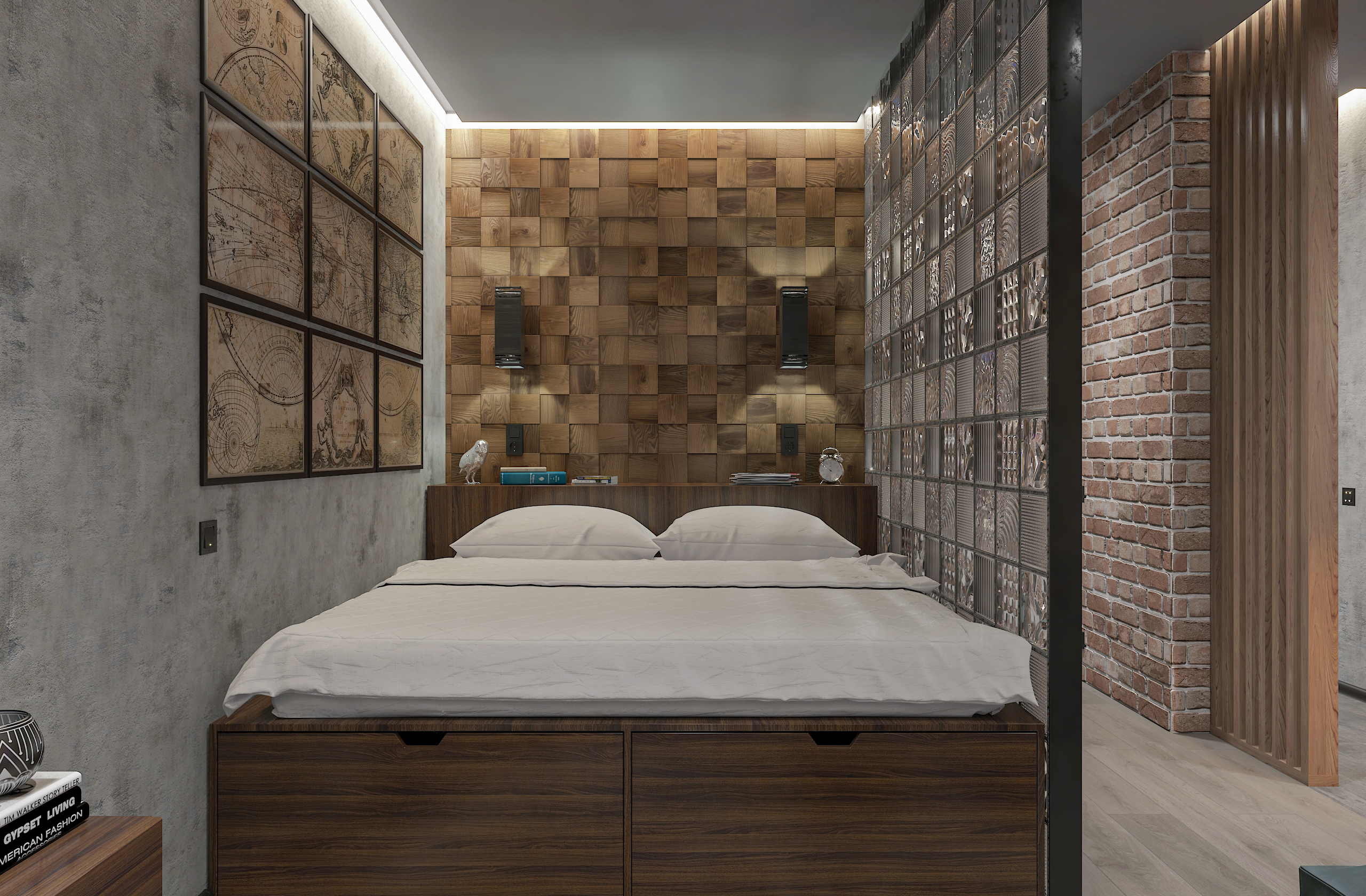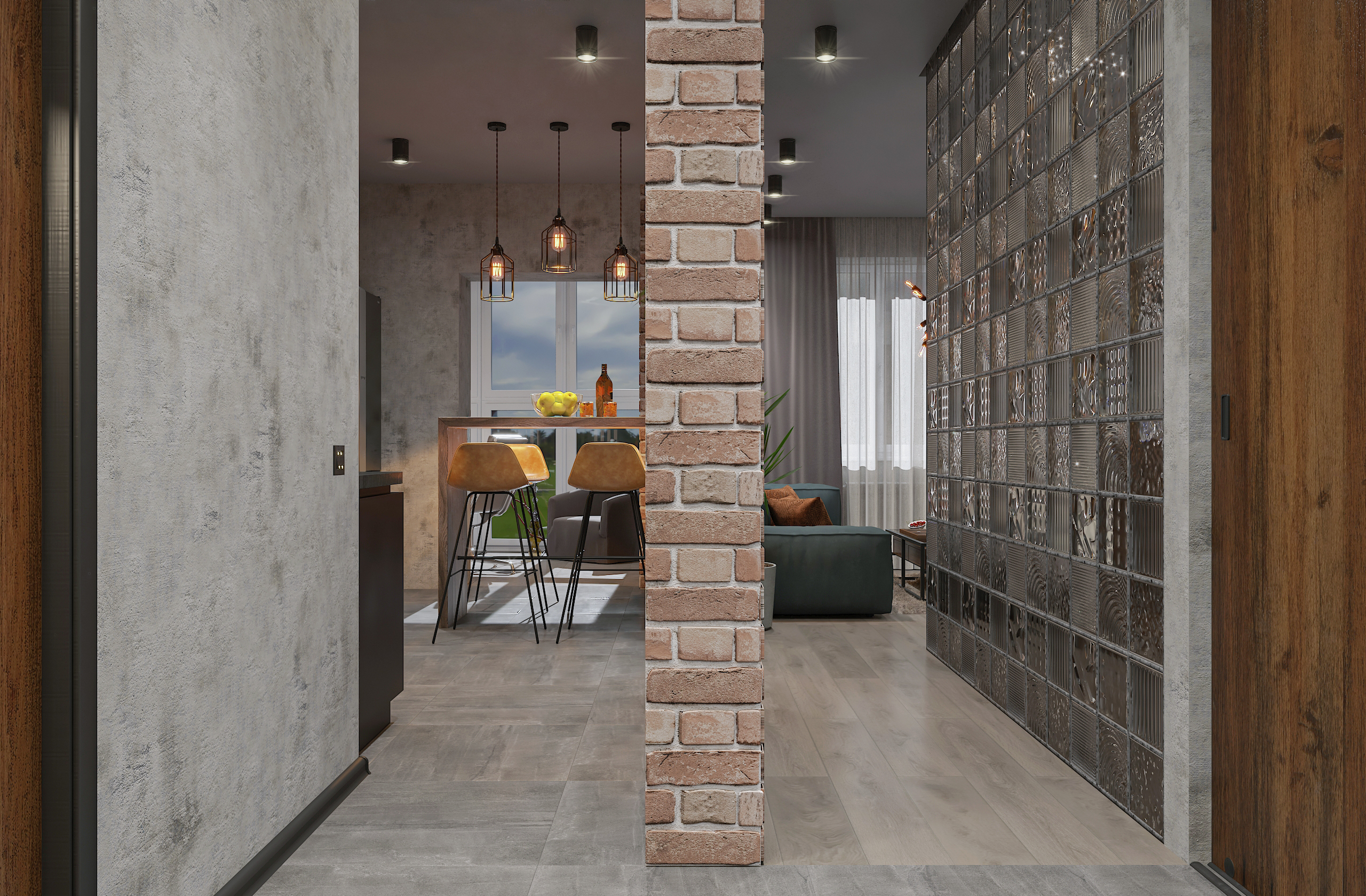 Продуманный лофт-интерьер студии площадью 45 м² сочетает брутальные материалы — кирпич, бетон, дерево, стеклоблоки и черный металл — с домашним уютом активного горожанина.