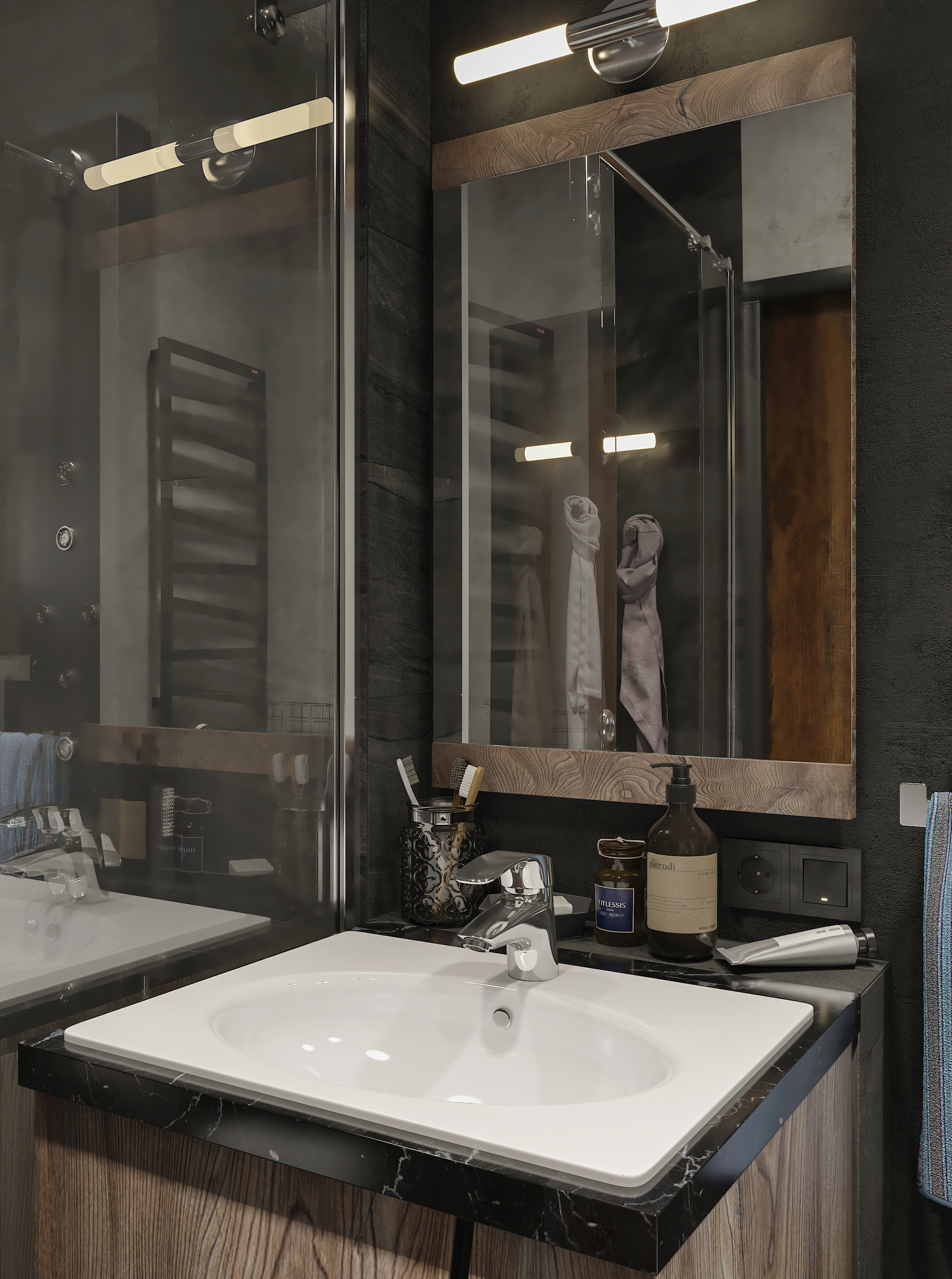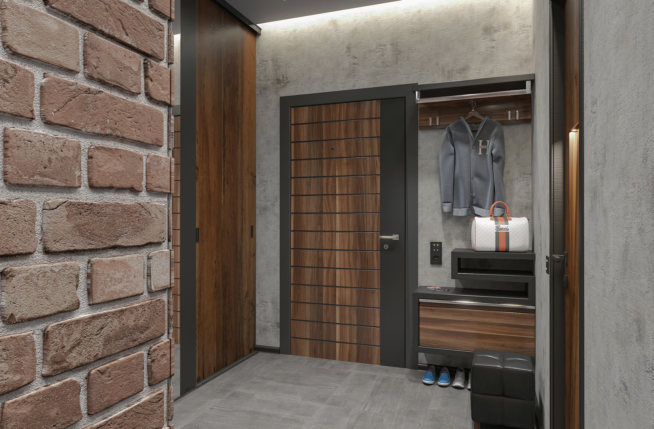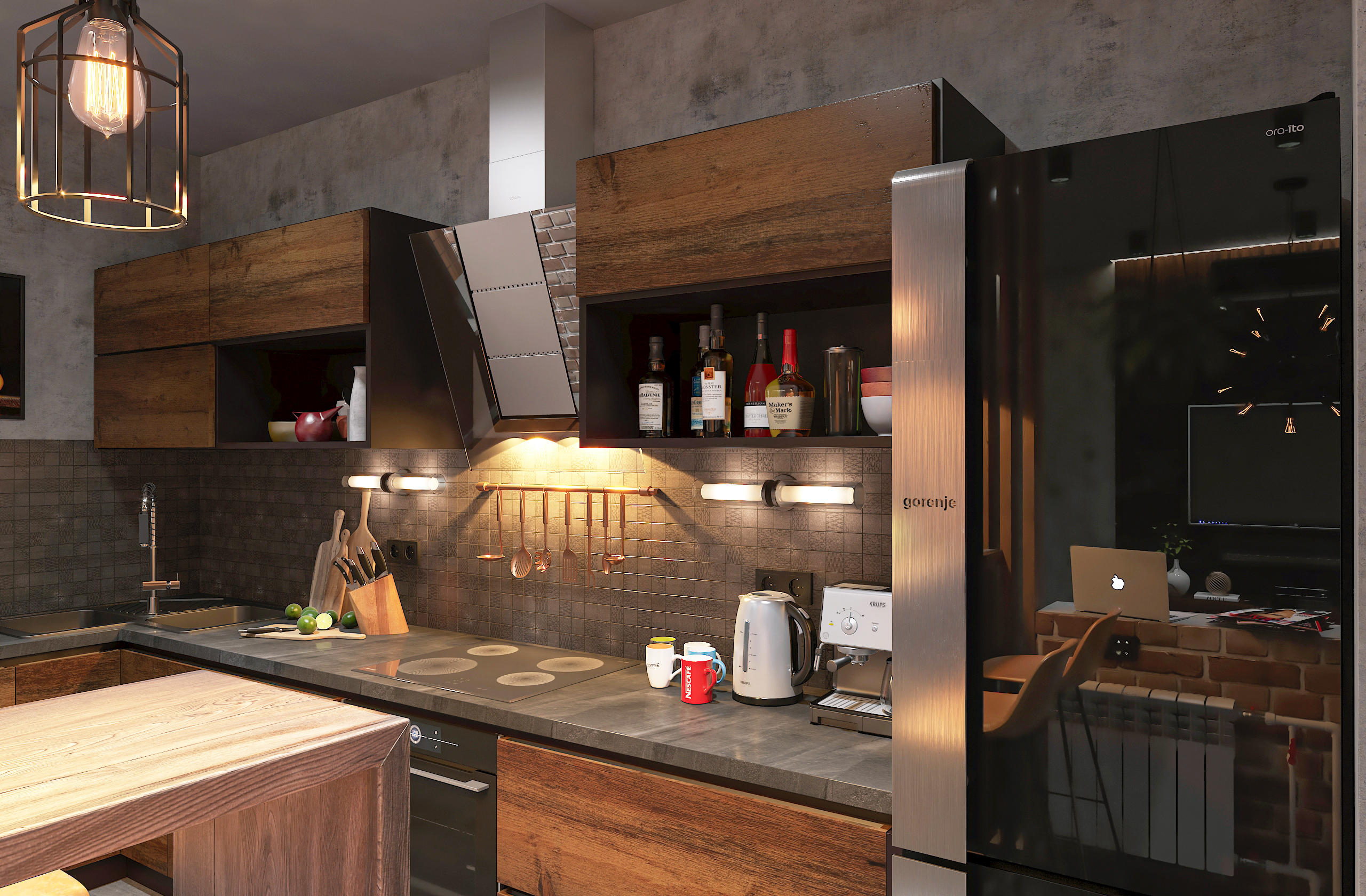 Продуманный лофт-интерьер студии площадью 45 м² сочетает брутальные материалы — кирпич, бетон, дерево, стеклоблоки и черный металл — с домашним уютом активного горожанина.