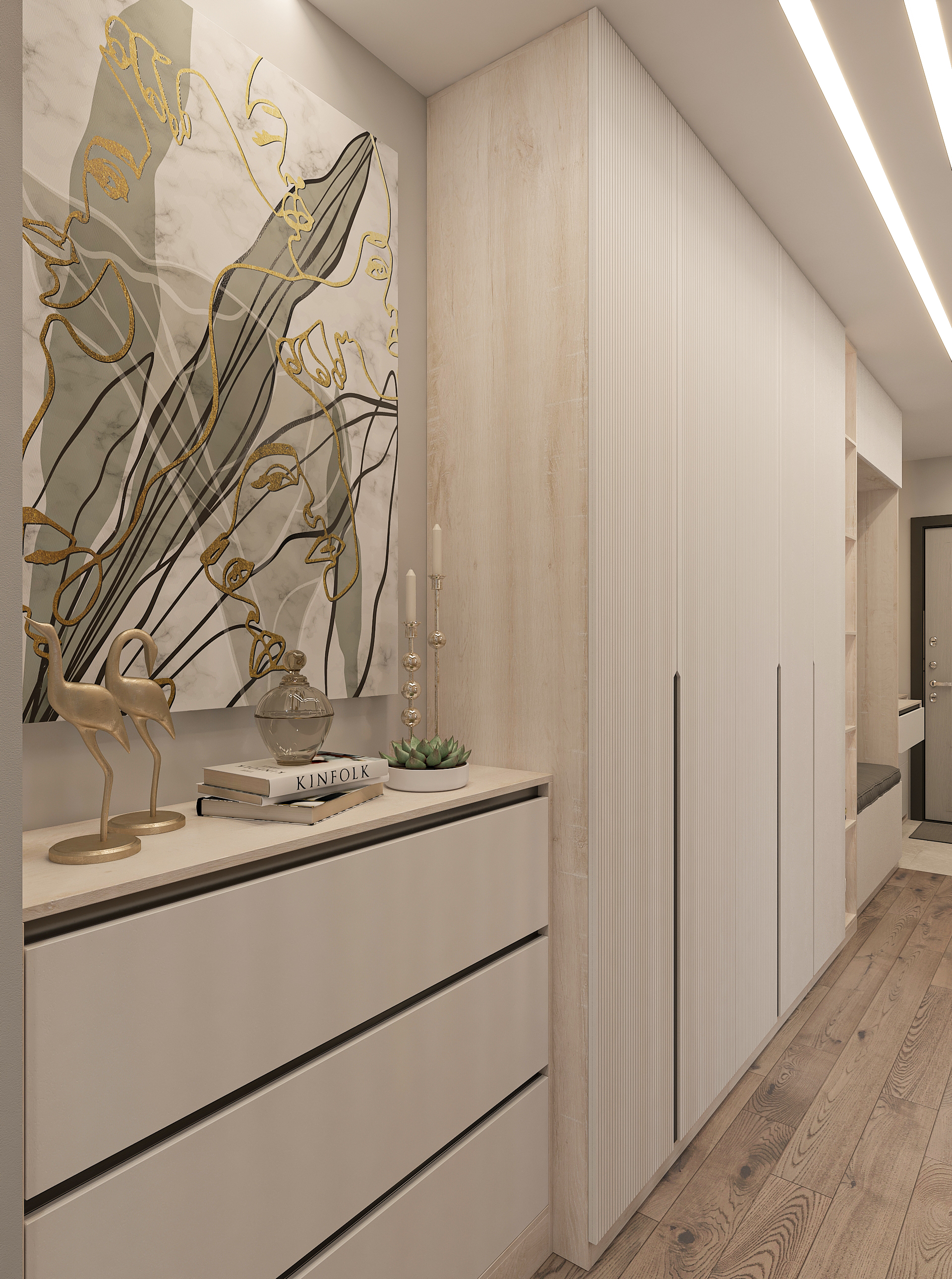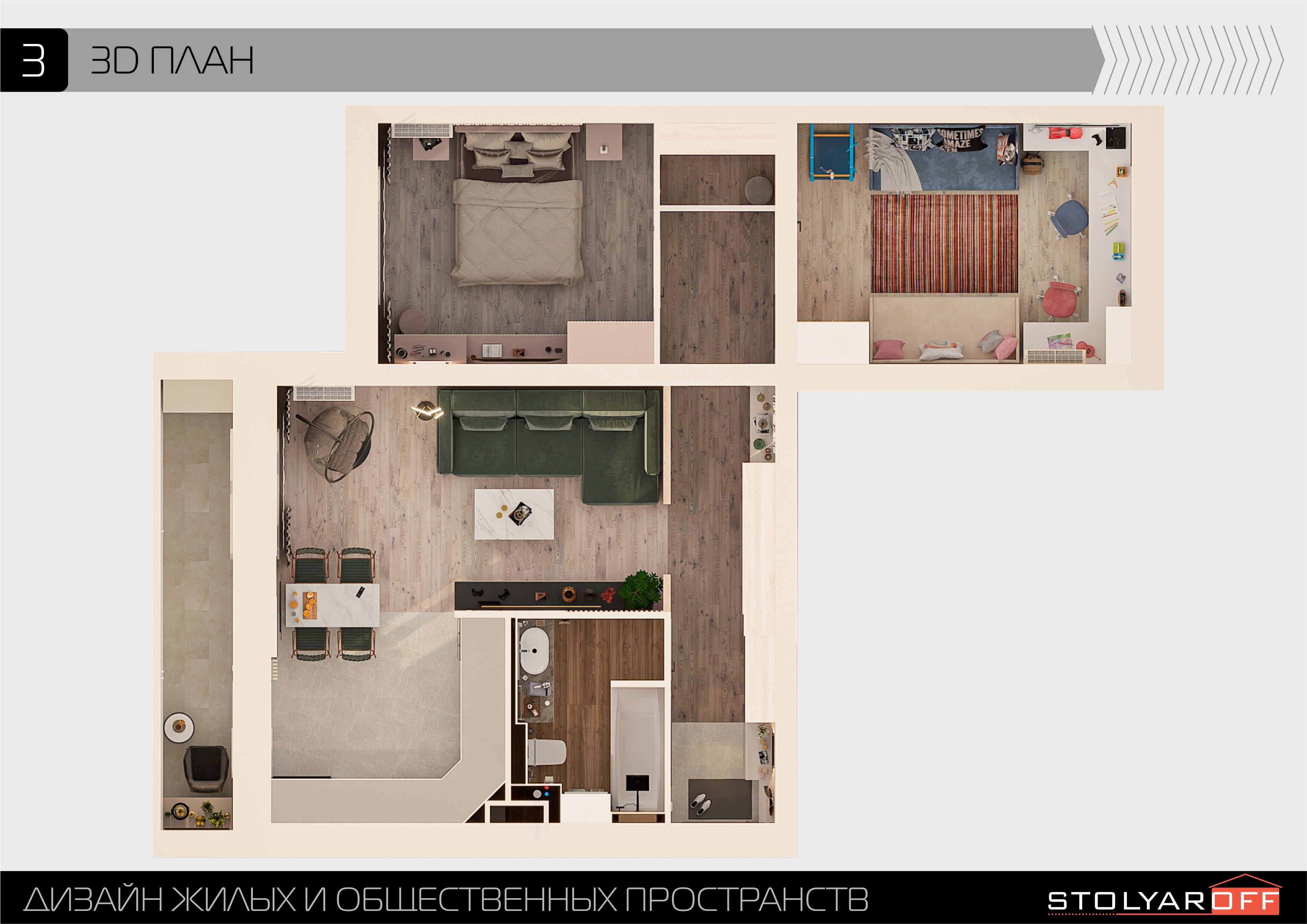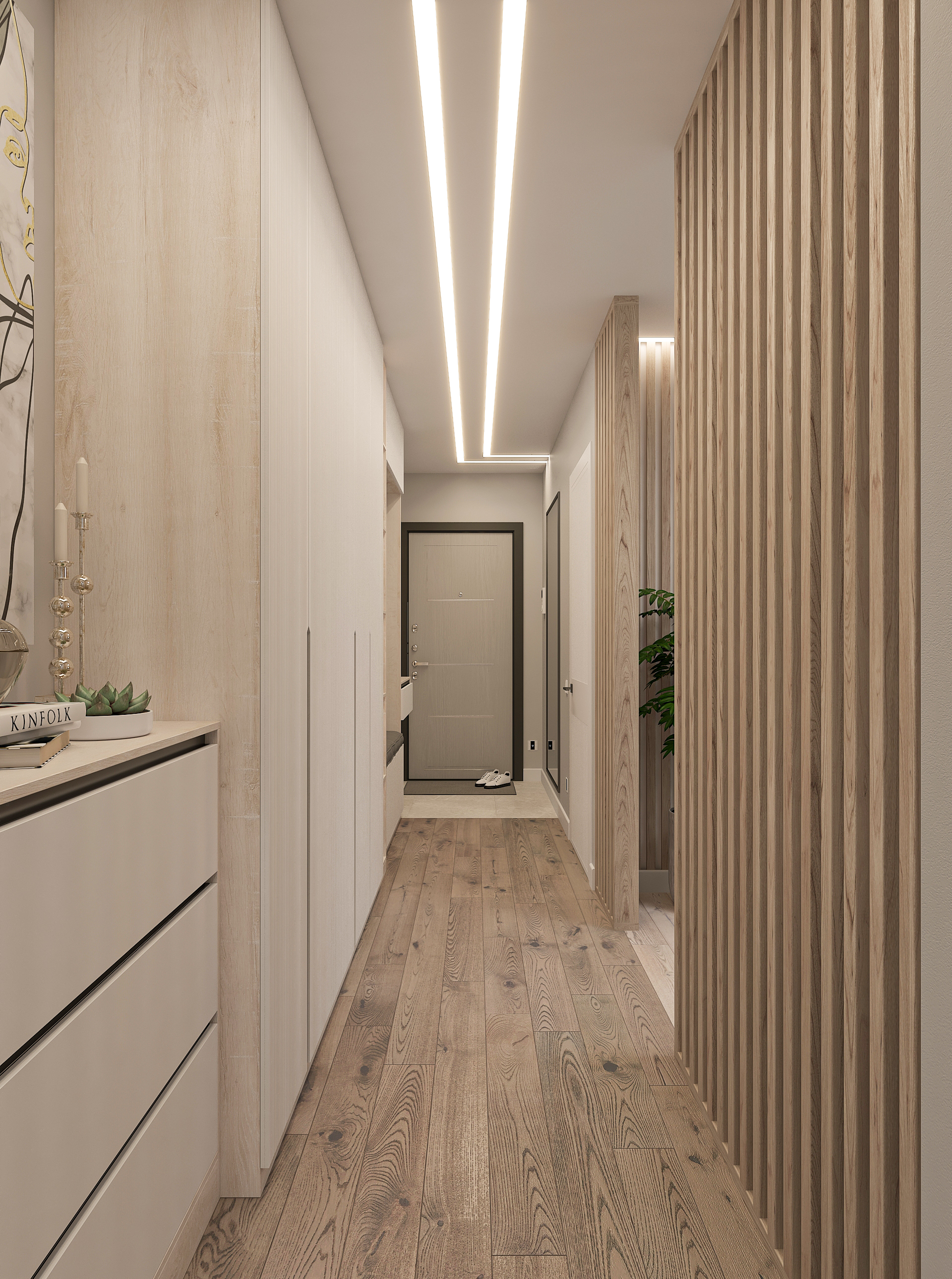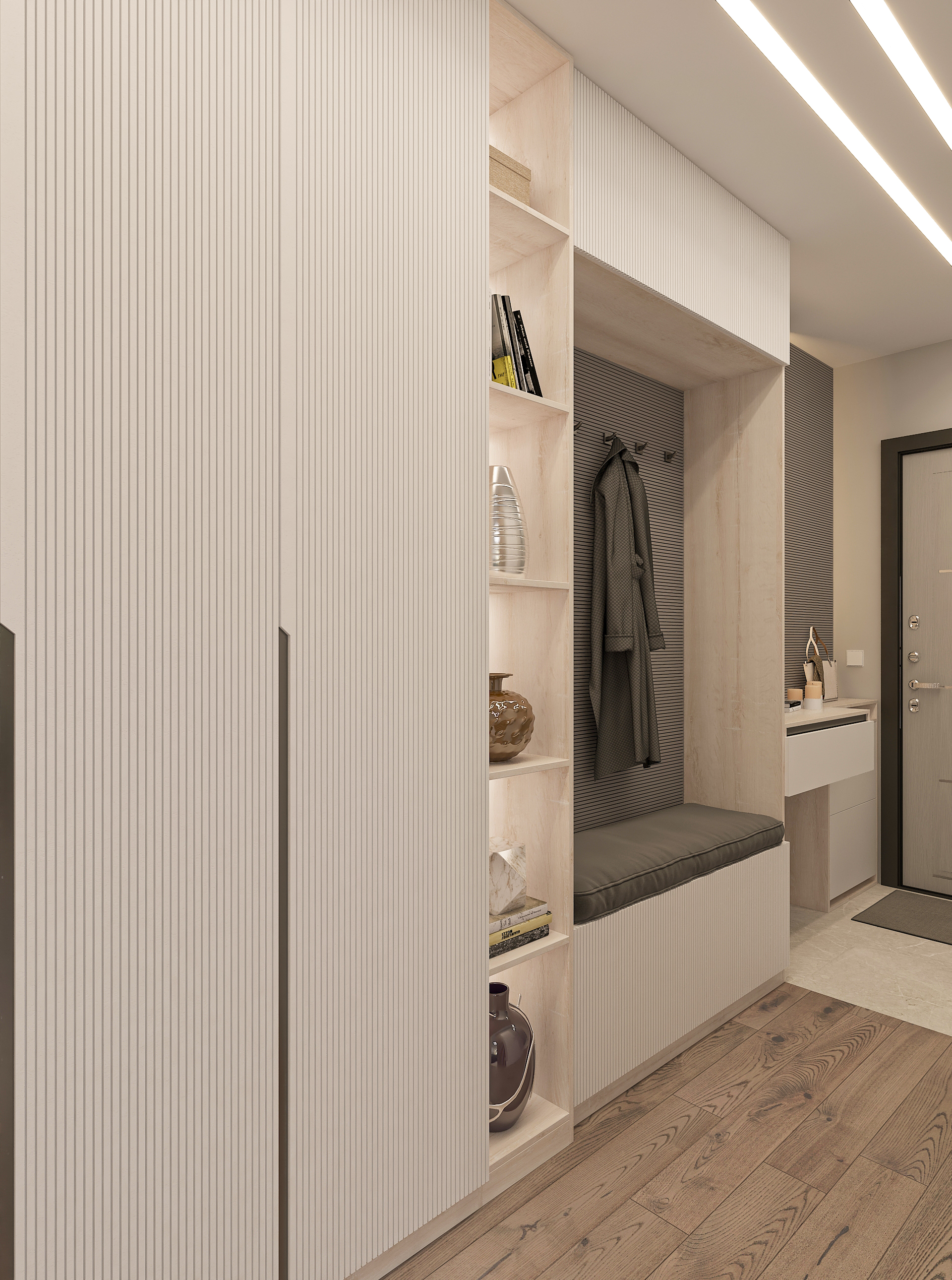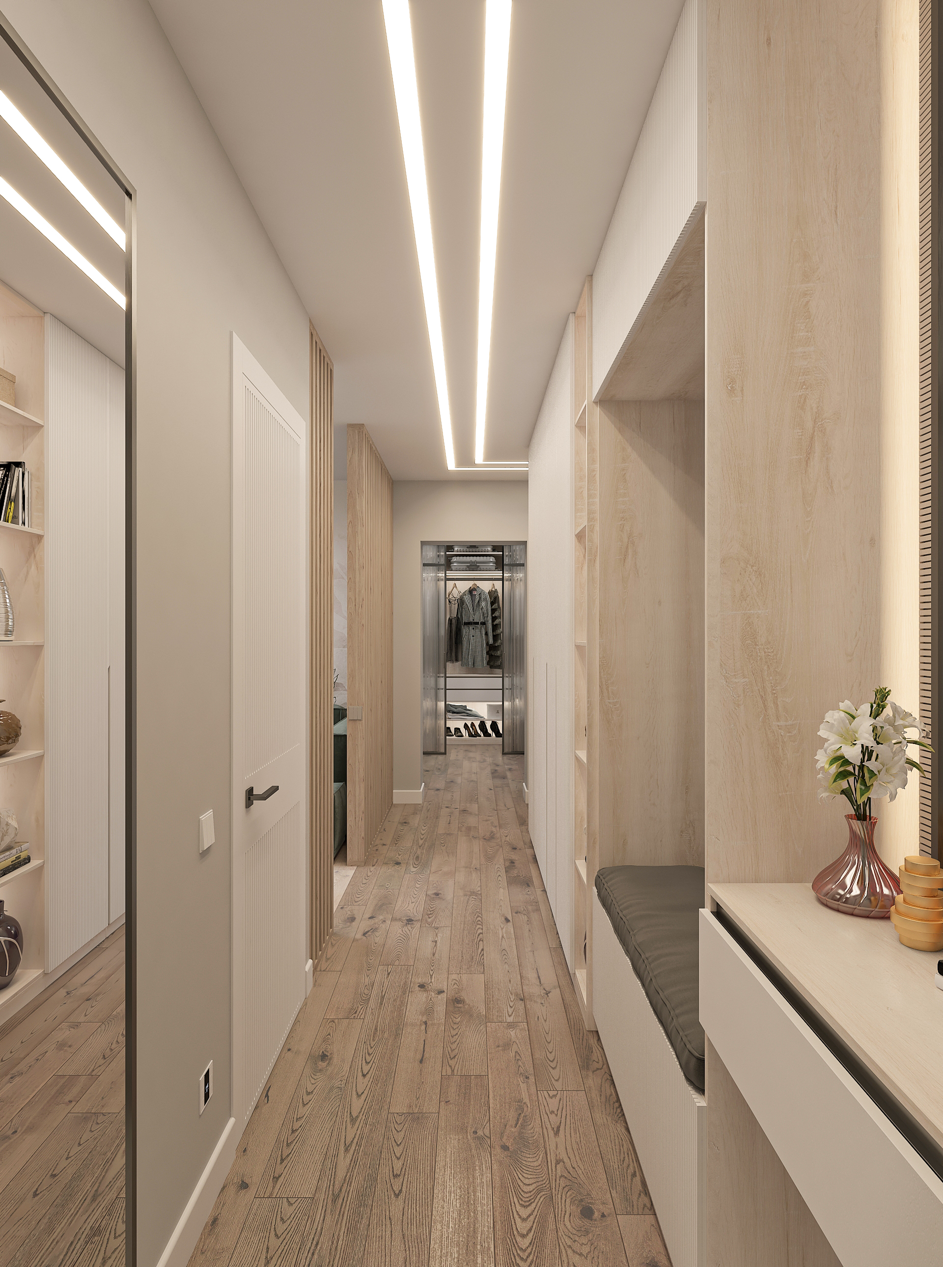Объединённая гостиная и кухня с природными акцентами создают уют для семьи и гостей. Яркая детская с учебными зонами и удобным хранением, спокойная спальня родителей и лоджия-зона для отдыха продуманы для комфорта. Просторная отдельная гардеробная с раздвижными стеклянными перегородками позволяет удобно хранить одежду и обувь всей семьи, поддерживает порядок в повседневной жизни. Продуманное многоуровневое освещение и практичные материалы подчёркивают функциональность и современный стиль проекта.