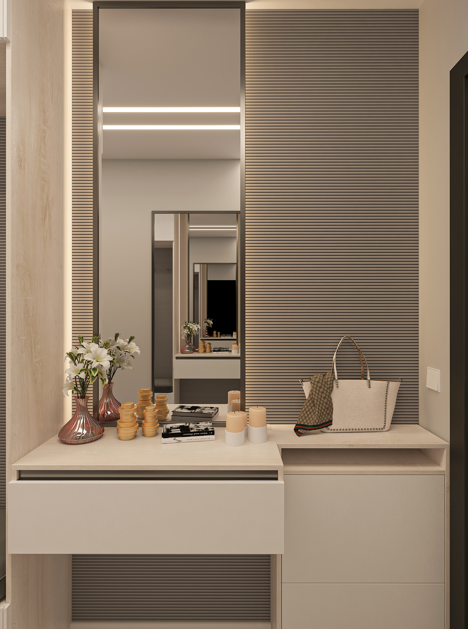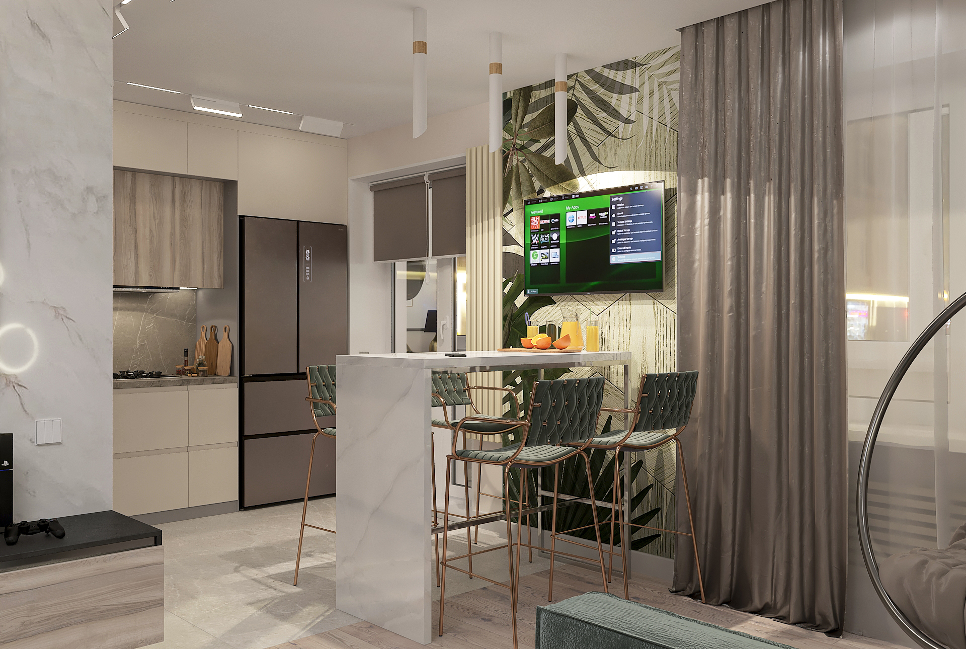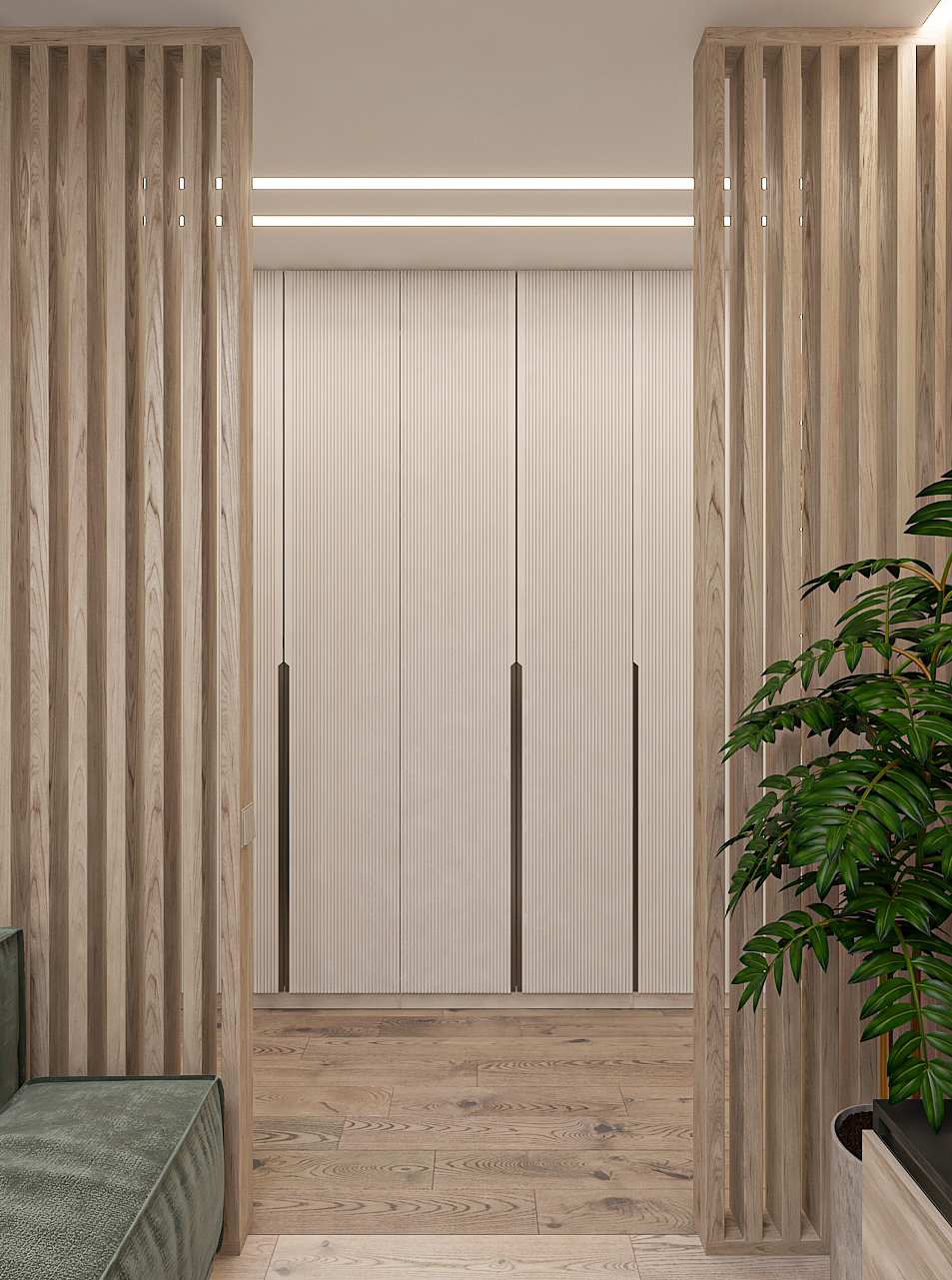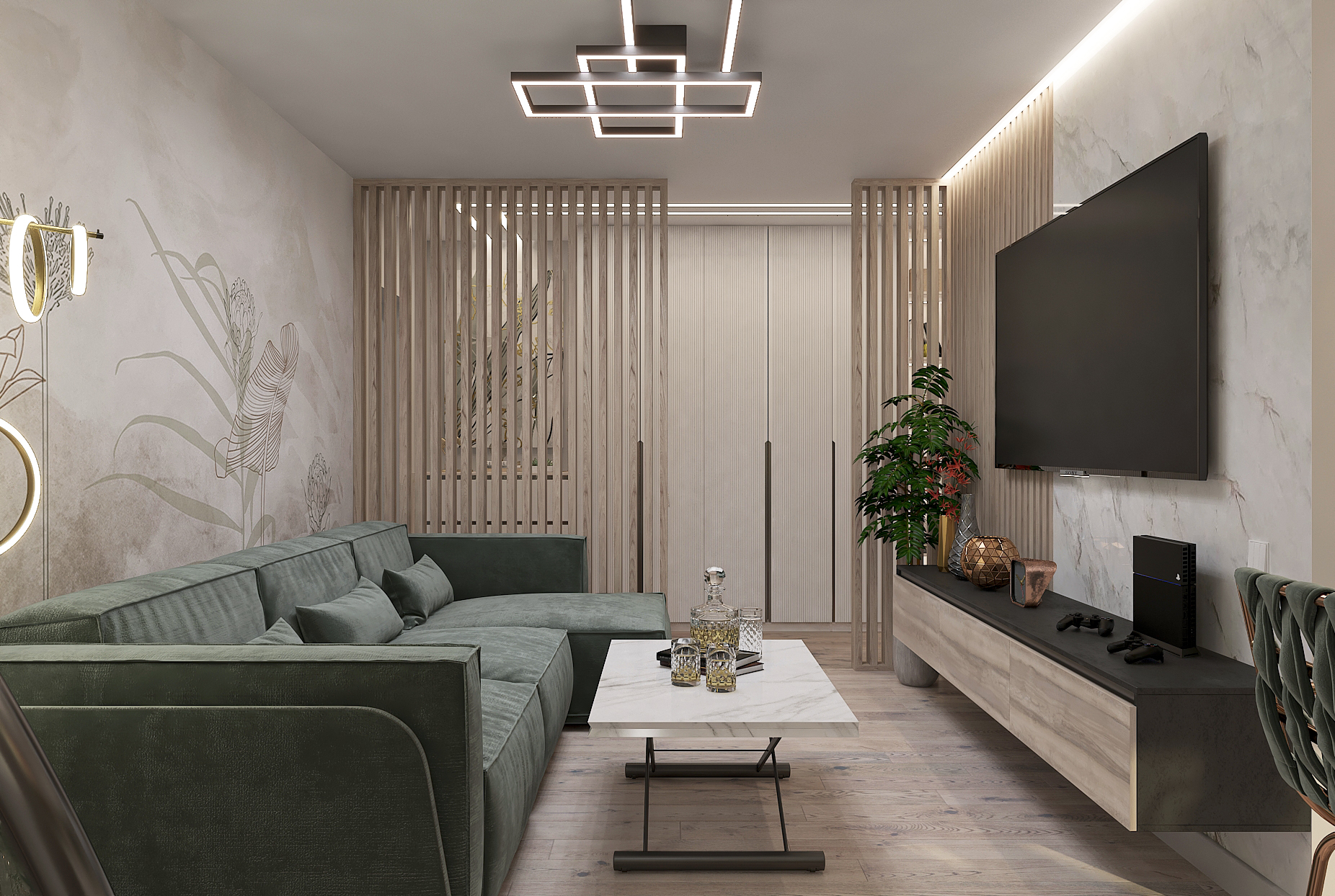 Объединённая гостиная и кухня с природными акцентами создают уют для семьи и гостей. Яркая детская с учебными зонами и удобным хранением, спокойная спальня родителей и лоджия-зона для отдыха продуманы для комфорта. Просторная отдельная гардеробная с раздвижными стеклянными перегородками позволяет удобно хранить одежду и обувь всей семьи, поддерживает порядок в повседневной жизни. Продуманное многоуровневое освещение и практичные материалы подчёркивают функциональность и современный стиль проекта.