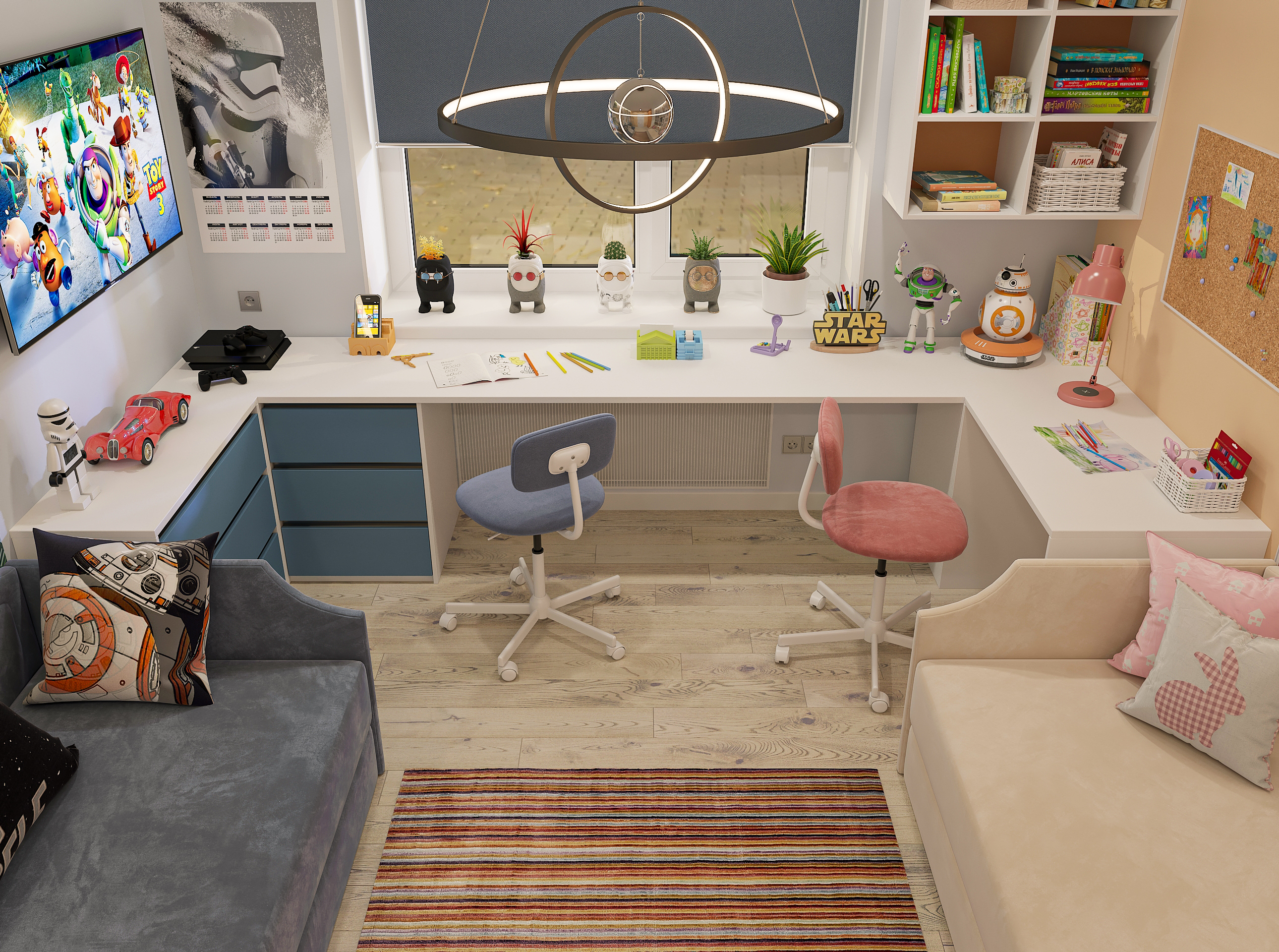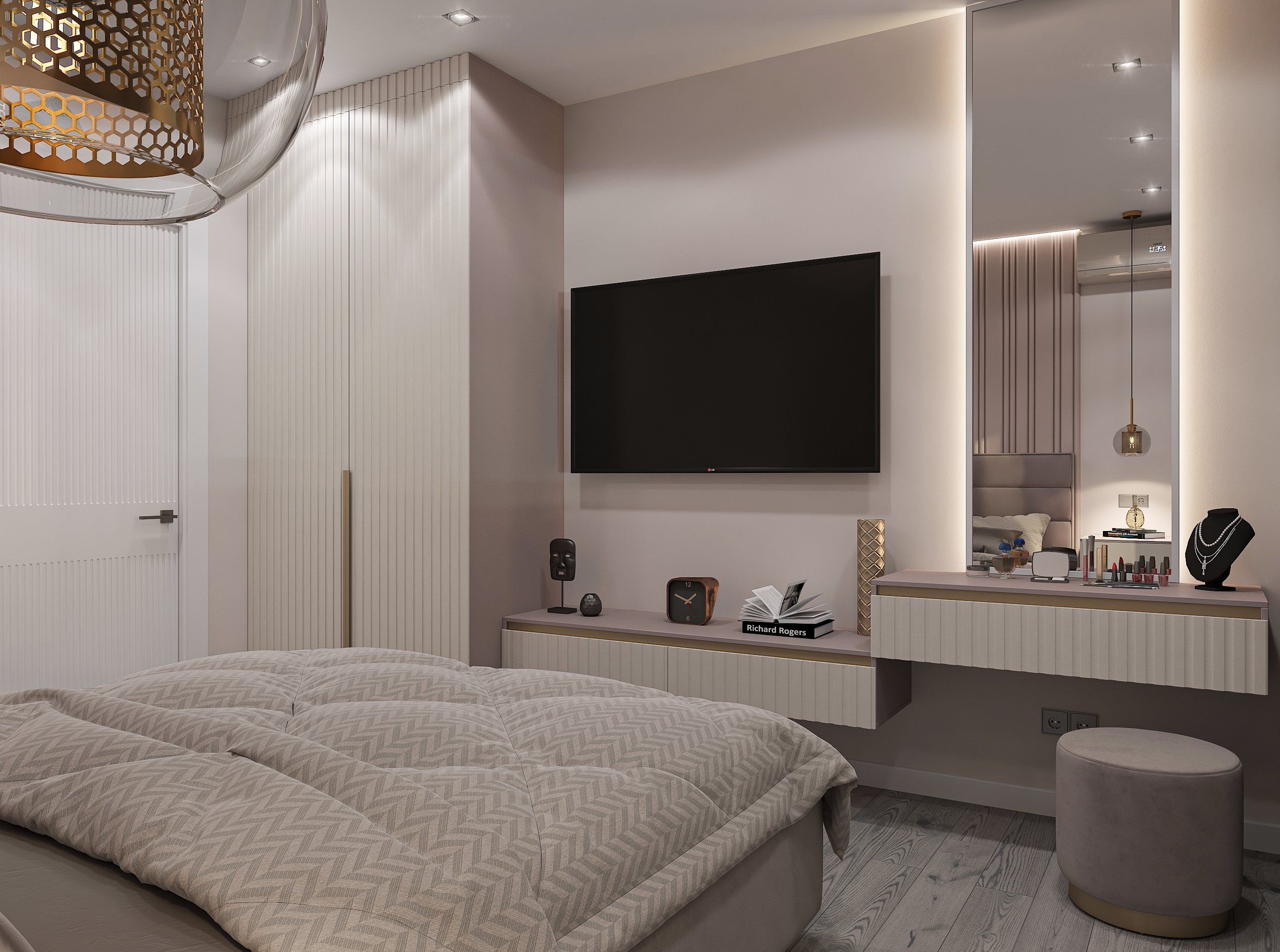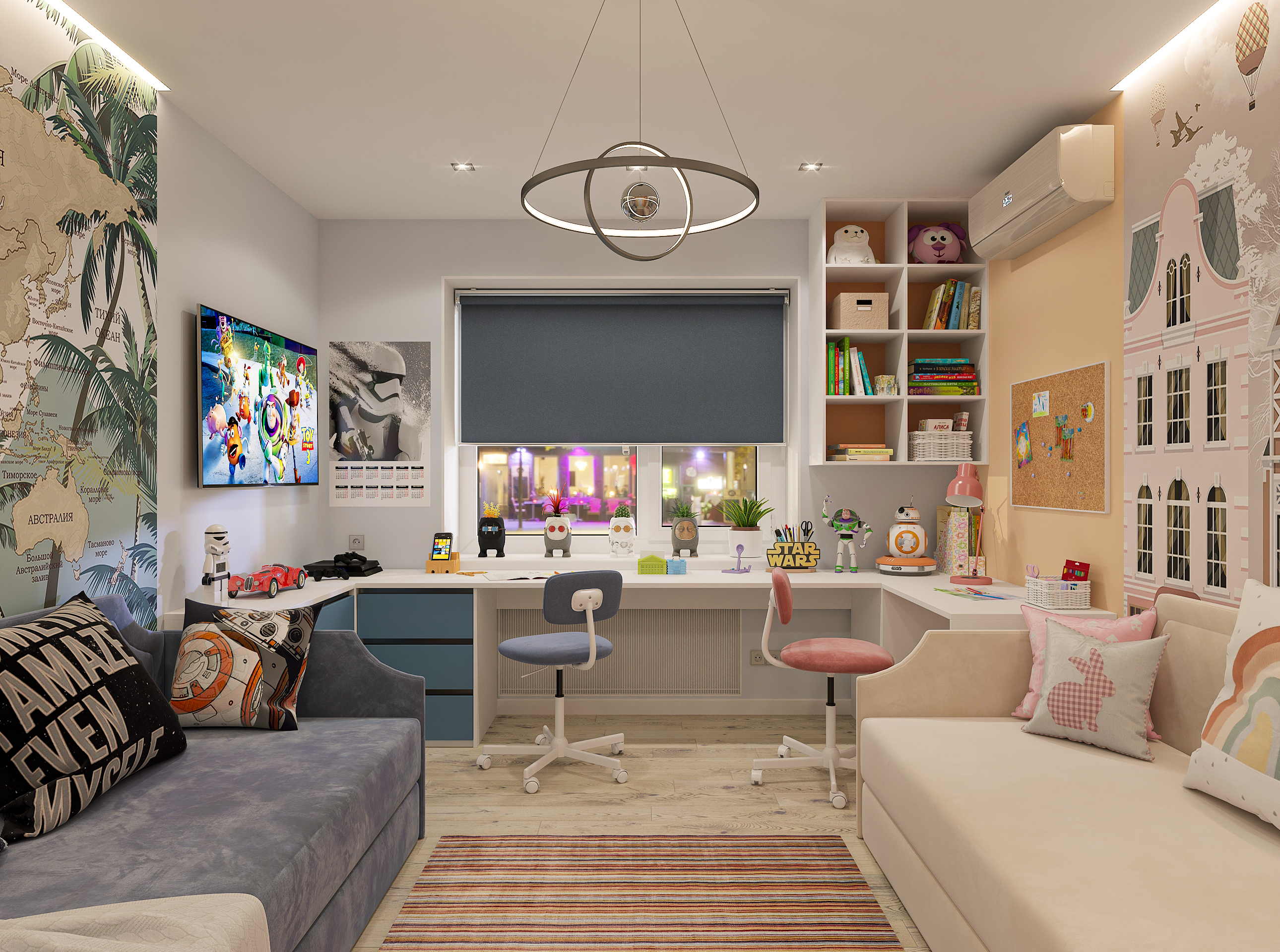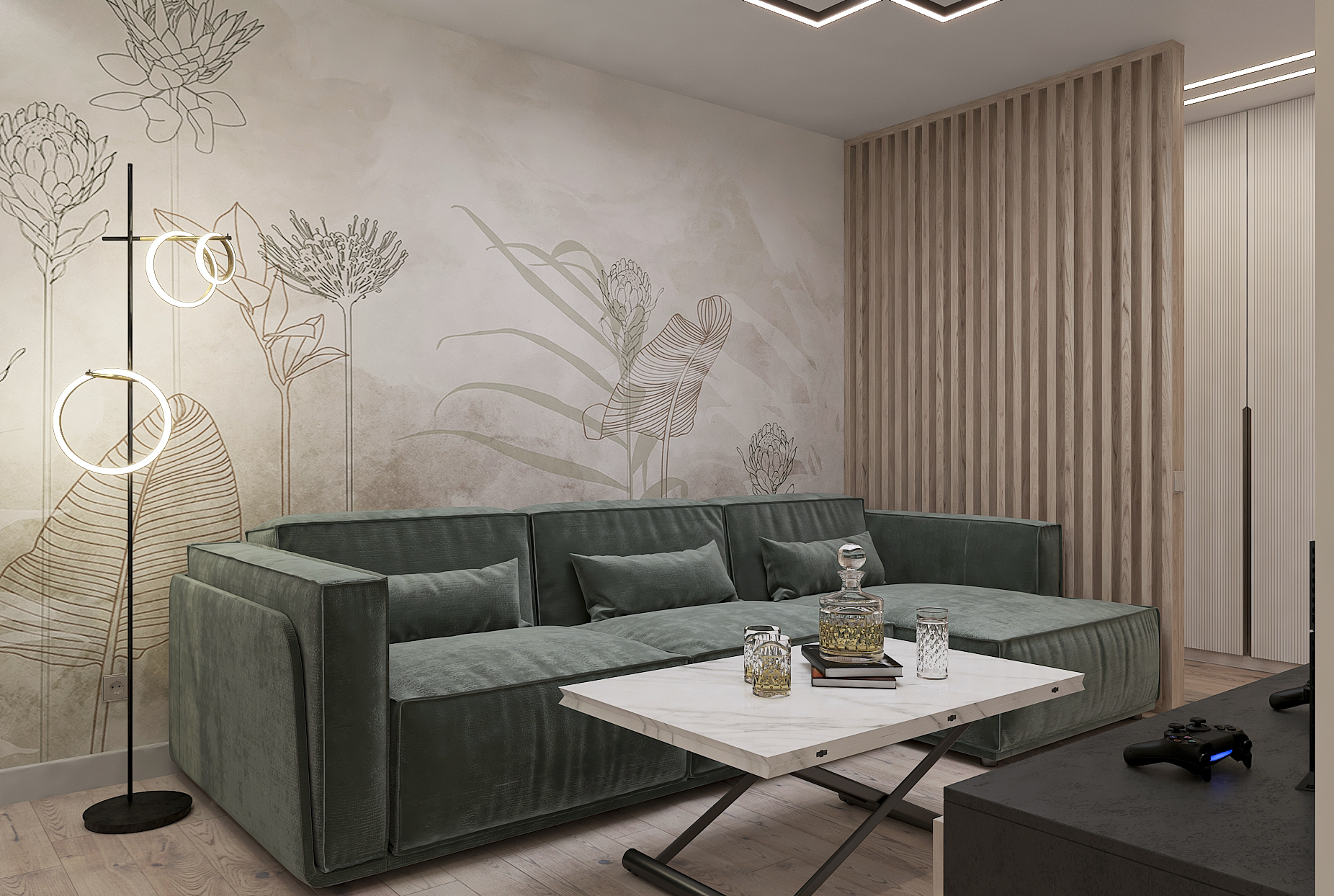 Объединённая гостиная и кухня с природными акцентами создают уют для семьи и гостей. Яркая детская с учебными зонами и удобным хранением, спокойная спальня родителей и лоджия-зона для отдыха продуманы для комфорта. Просторная отдельная гардеробная с раздвижными стеклянными перегородками позволяет удобно хранить одежду и обувь всей семьи, поддерживает порядок в повседневной жизни. Продуманное многоуровневое освещение и практичные материалы подчёркивают функциональность и современный стиль проекта.
